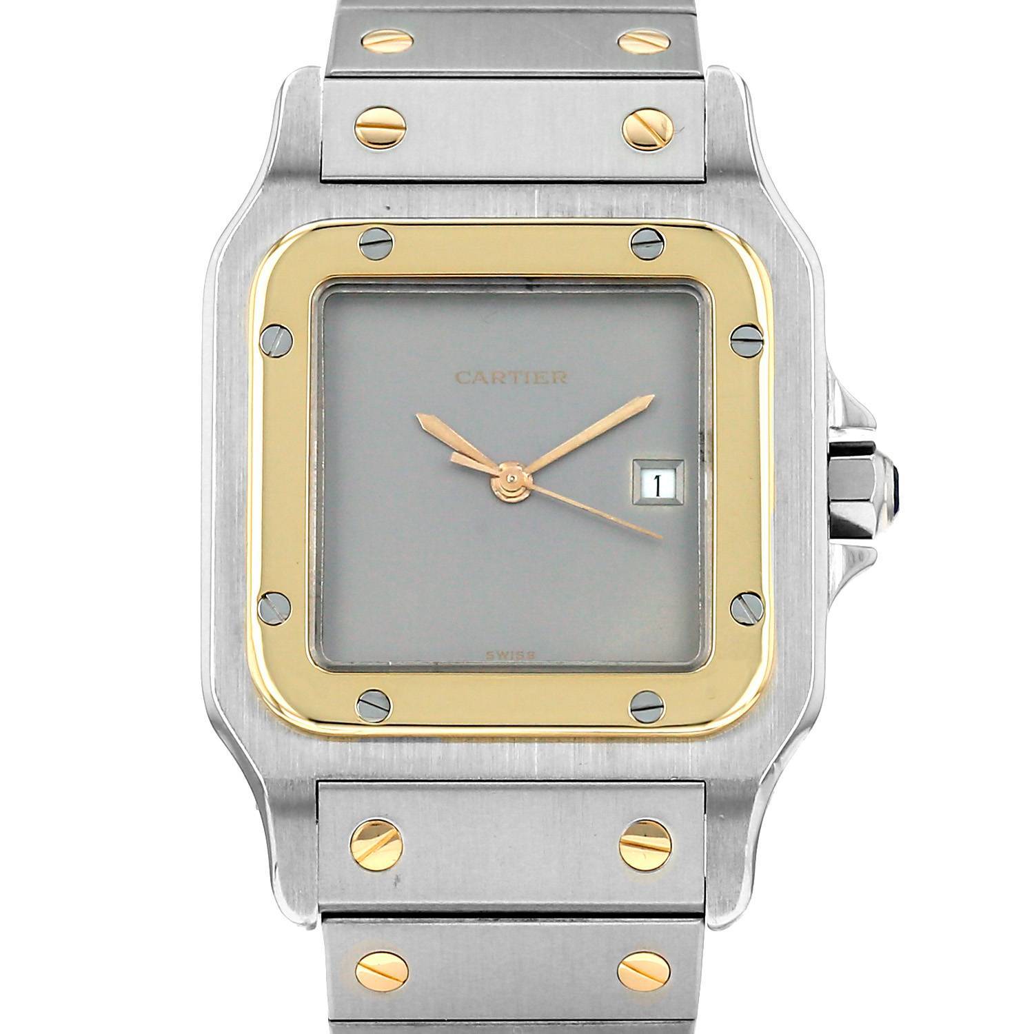 Montre bracelet Cartier Santos en or et acier. Boitier rectangulaire en or et acier, fond vissé, lunette vissée en or jaune, couronne cannelée sertie d'un cabochon de saphir.