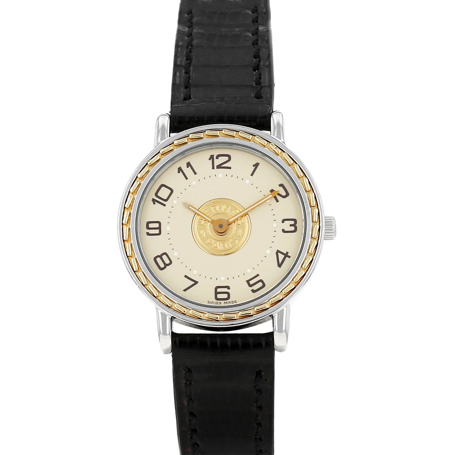 Montre bracelet Hermès Sellier en acier et plaqué or. Boitier rond en acier, fond clippé, lunette en plaqué or, couronne cannelée.