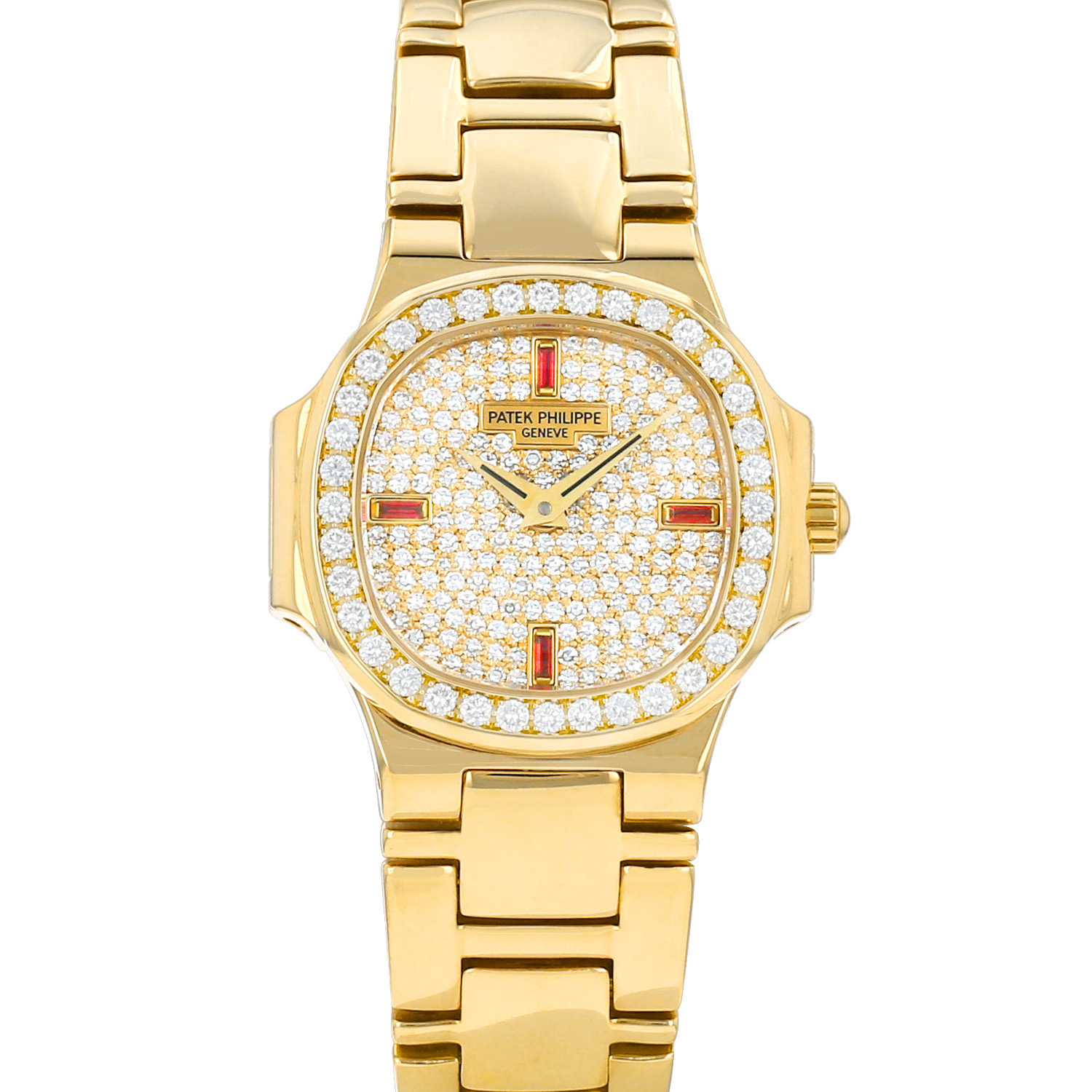 Montre bracelet Patek Philippe Nautilus en or jaune et diamanté. Boitier coussin en or jaune, fond vissé, lunette en or jaune diamantée, couronne cannelée.