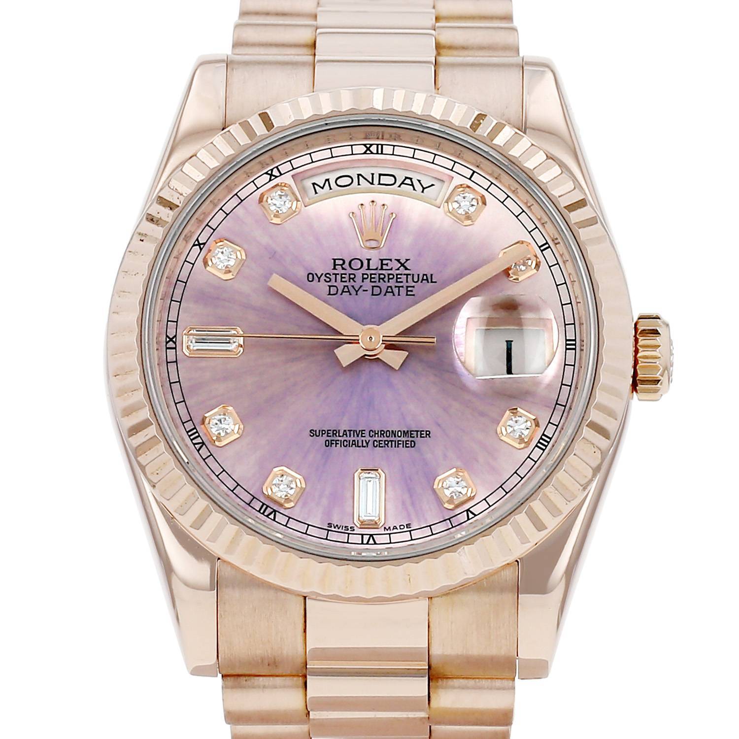 Montre bracelet Rolex Day-Date en or rose. Boitier rond en or rose, fond vissé, lunette striée en or rose, couronne vissée.